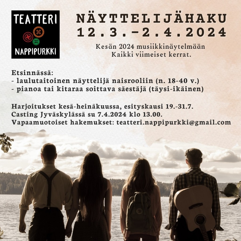 Teatteri Nappipurkki etsii kahta esiintyjää kesällä Jyväskylässä toteutettavaan näytelmäproduktioon.